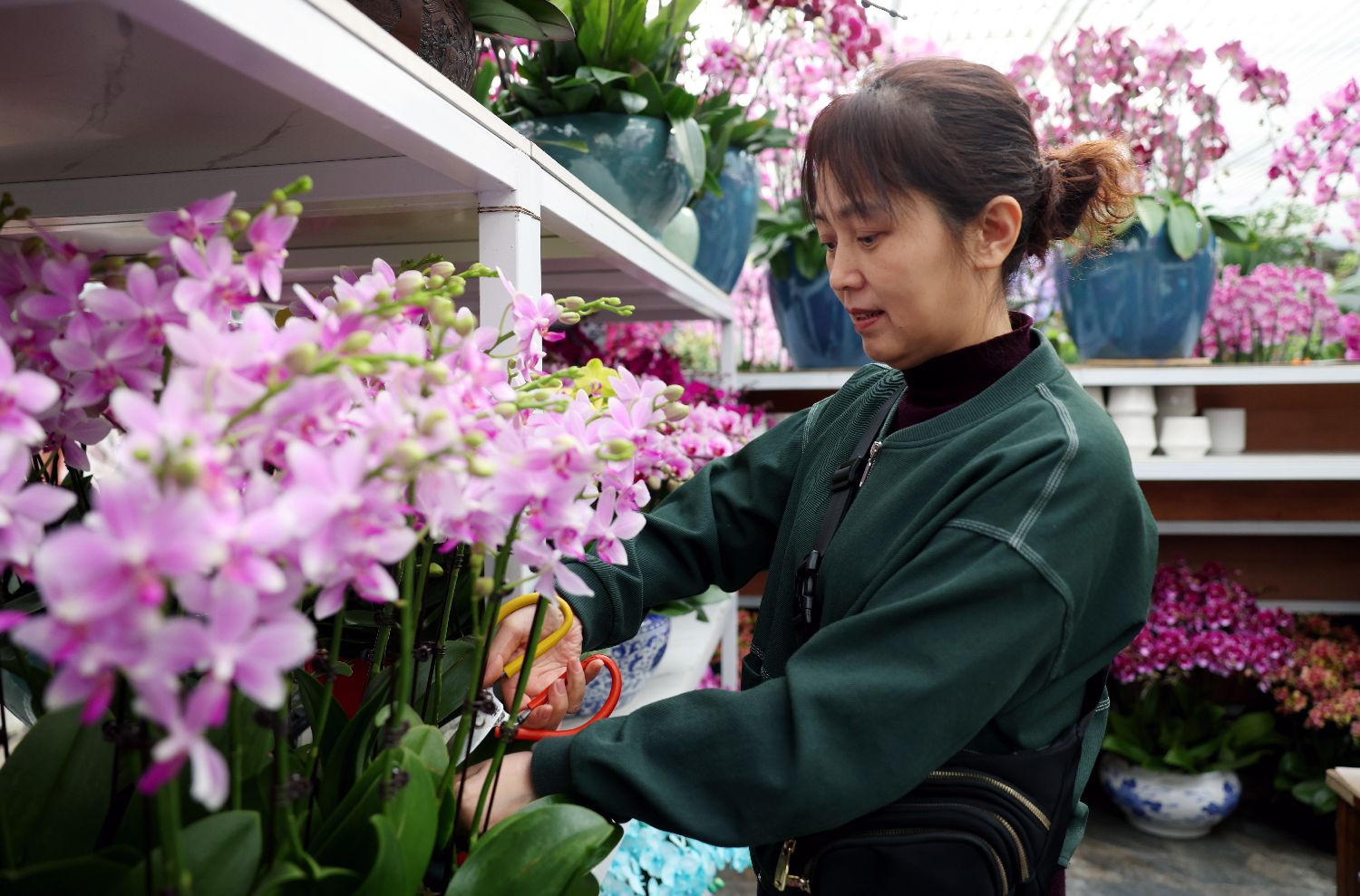 11日,北京花乡花卉创意园,蝴蝶兰店主王红梅正在修剪花枝。