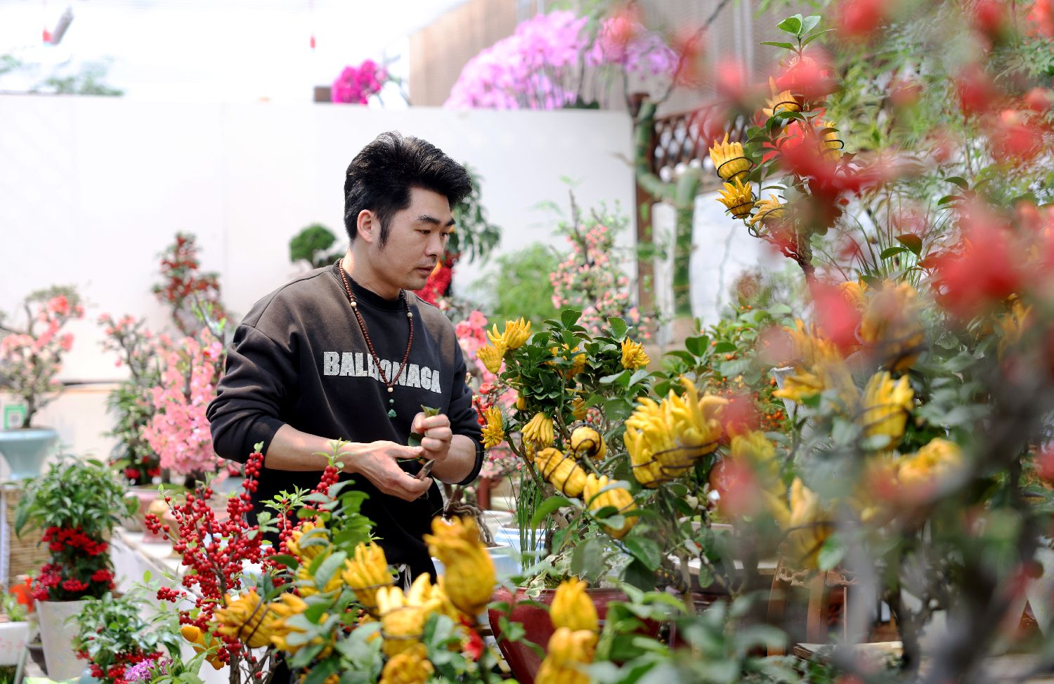 11日,北京花乡花卉创意园,佛手专营店老板胡建海查看佛手生长情况。