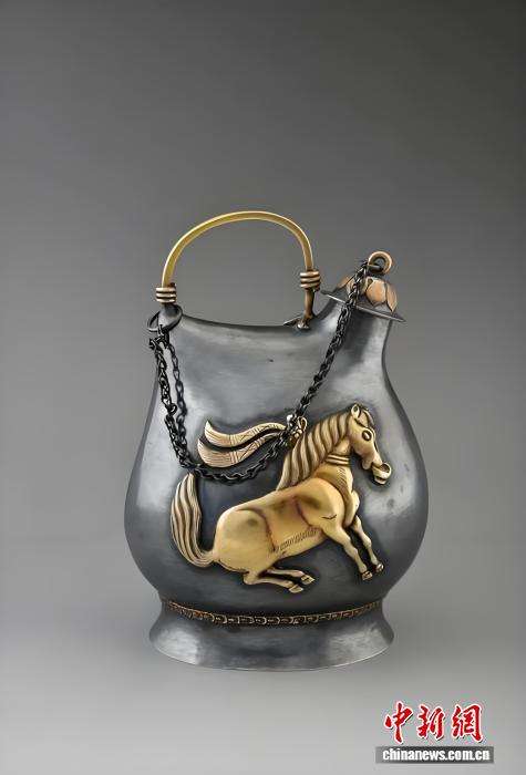 陕西何家村遗址出土唐代舞马衔杯铜壶。