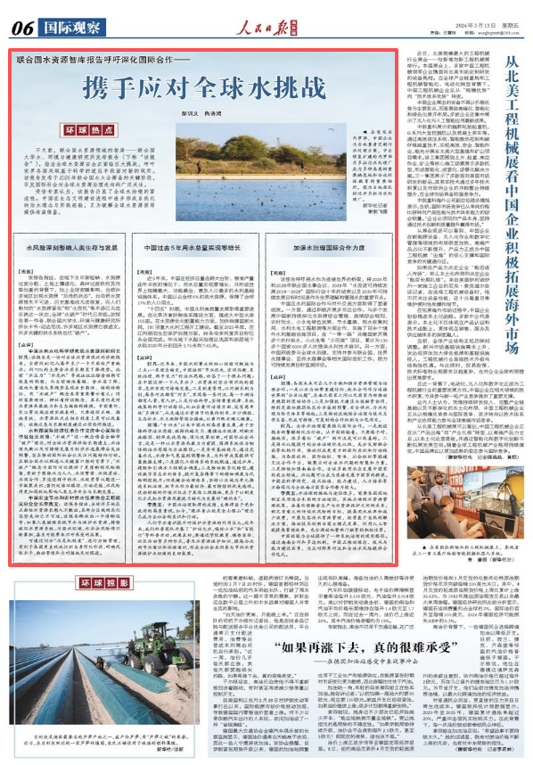 何凡:全球水治理需要强化国际合作。一是把该报告的警醒转化为行动。从中国经验看,只要路子对、措施实,很多看似“破产”的河流是可以改善的。二是将水议题提升到全球治理优先议程。充分发挥联合国等机构作用,推动形成更有力的国际共识和行动框架,为各国政府、国际组织、智库、社会组织等搭建交流合作平台,凝聚应对全球水问题的智慧和力量。三是持续加强南南合作。全球多数用水在发展中国家的农业领域。水议题可以成为连接发展中国家的桥梁。中国在科学研究、技术标准、能力建设、人才培养等方面深化与全球南方国家合作潜力较大。