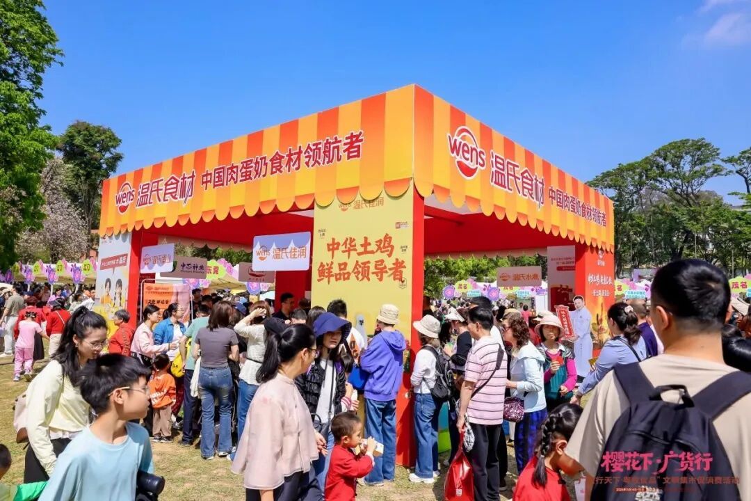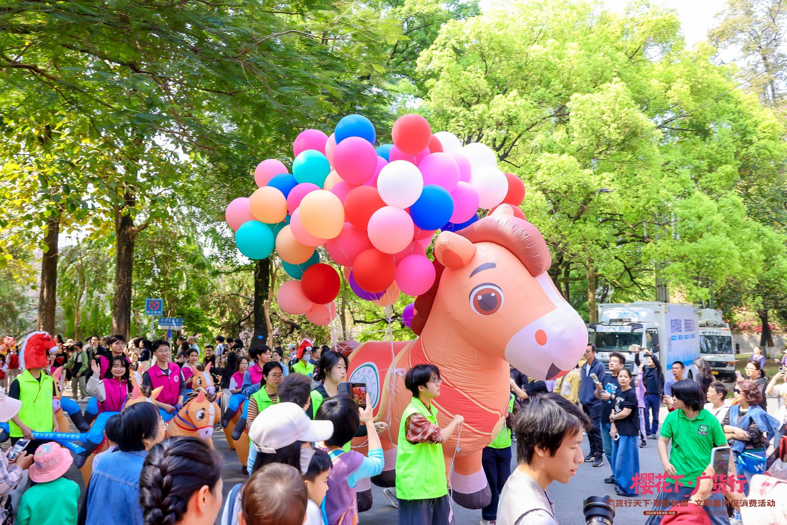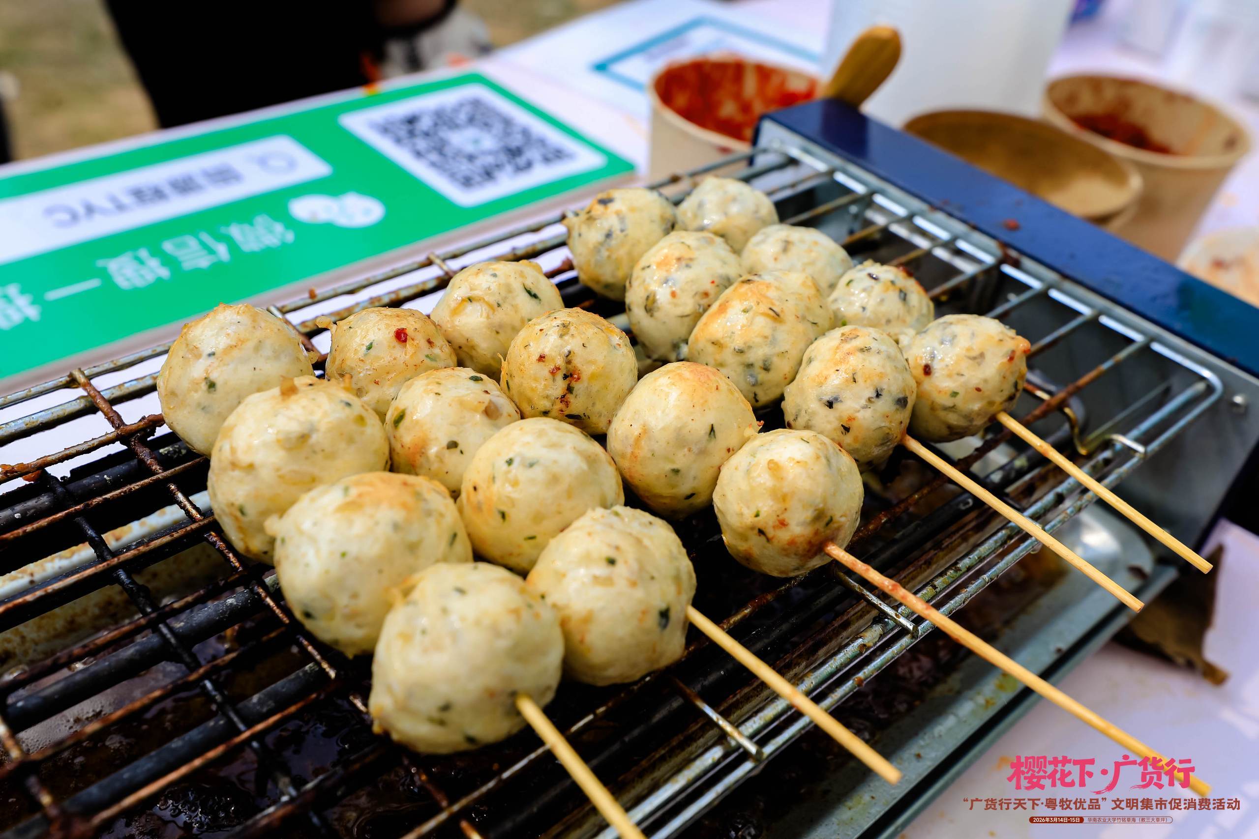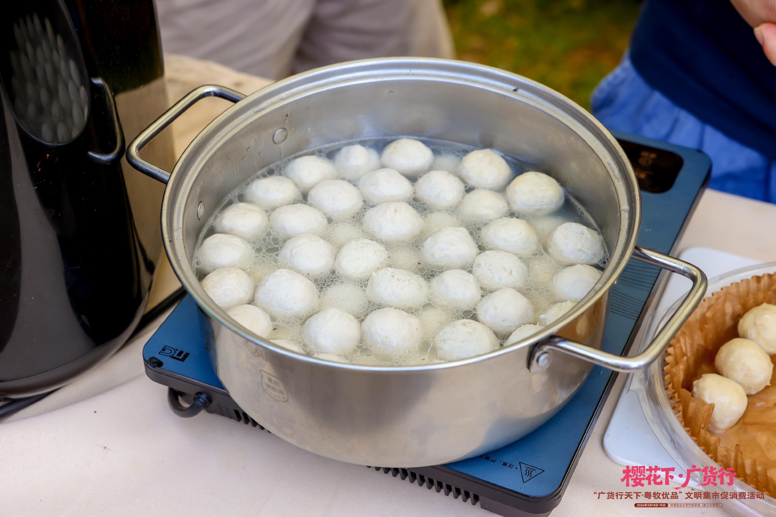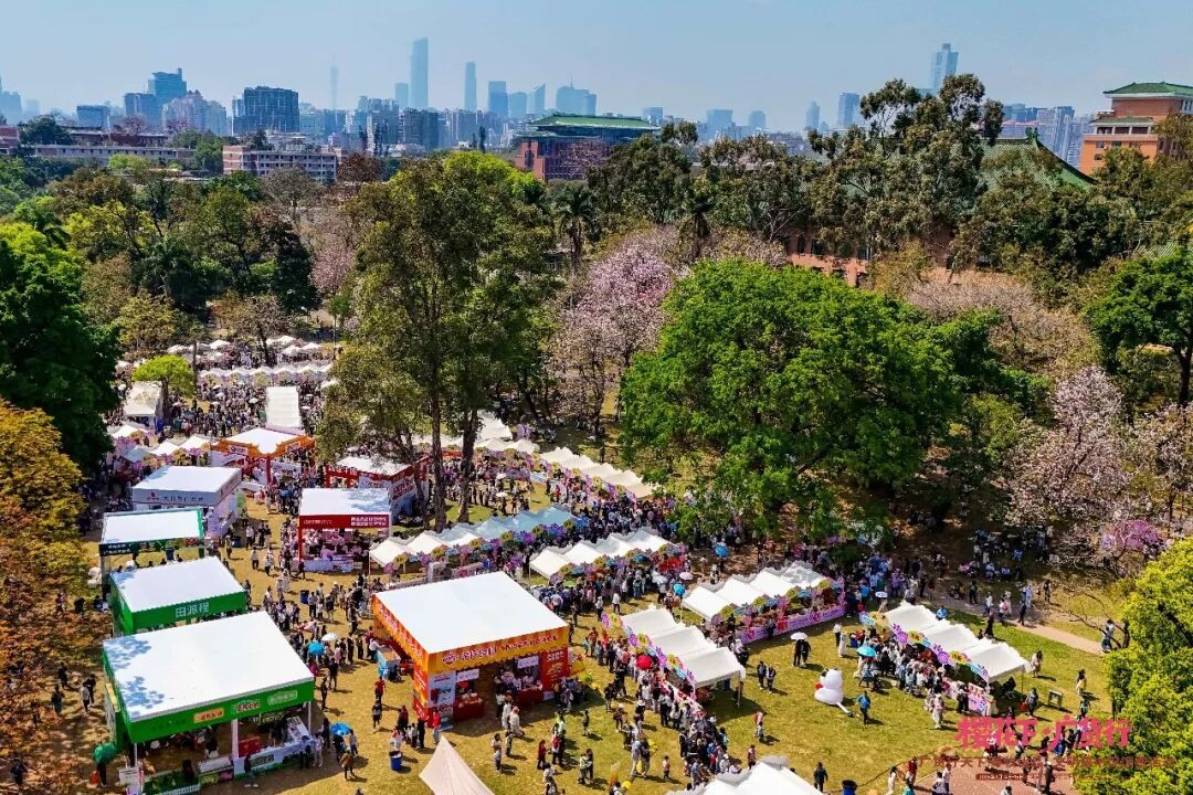 近2000株樱花盛开,花雨落满林荫道,粉白交错的紫荆花瓣也落在一排排热闹的摊位之间,人群与花影交织在一起。牛肉丸翻滚出热气,土鸡、烤牛蛙肉、腊味香味四溢。