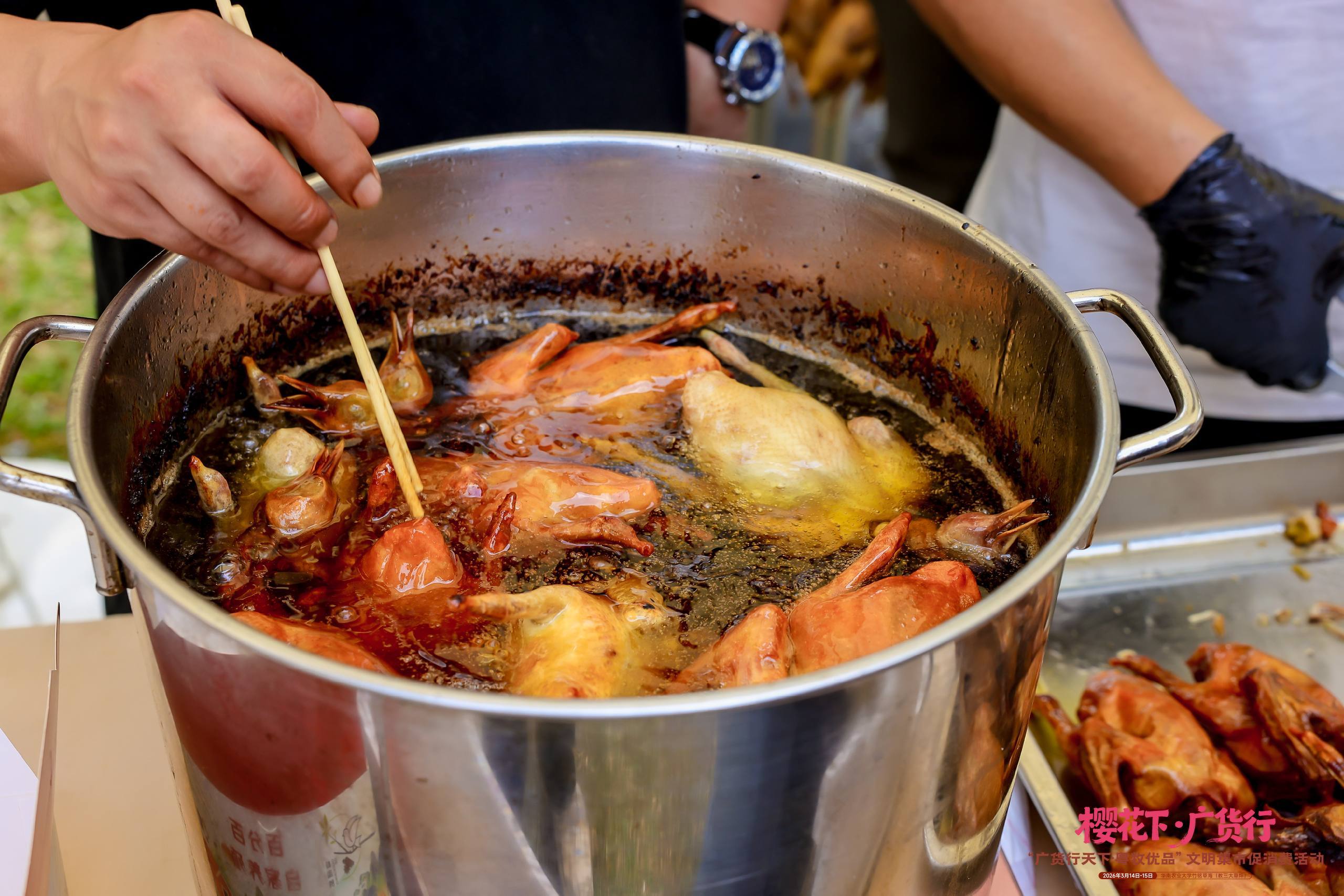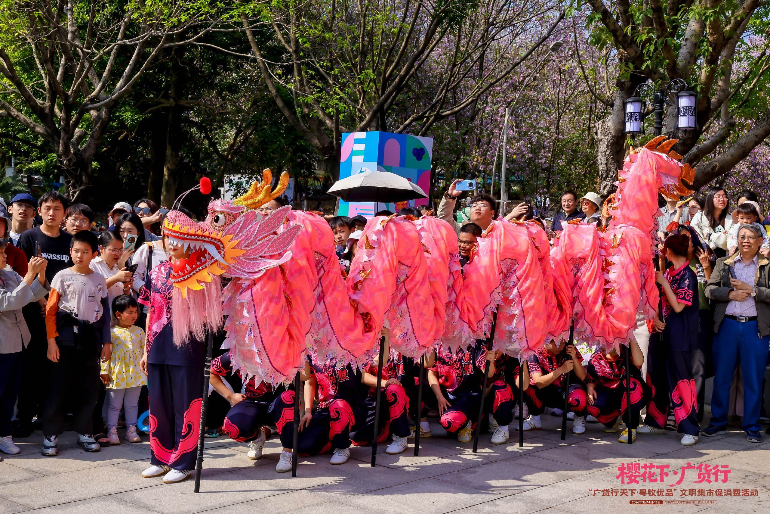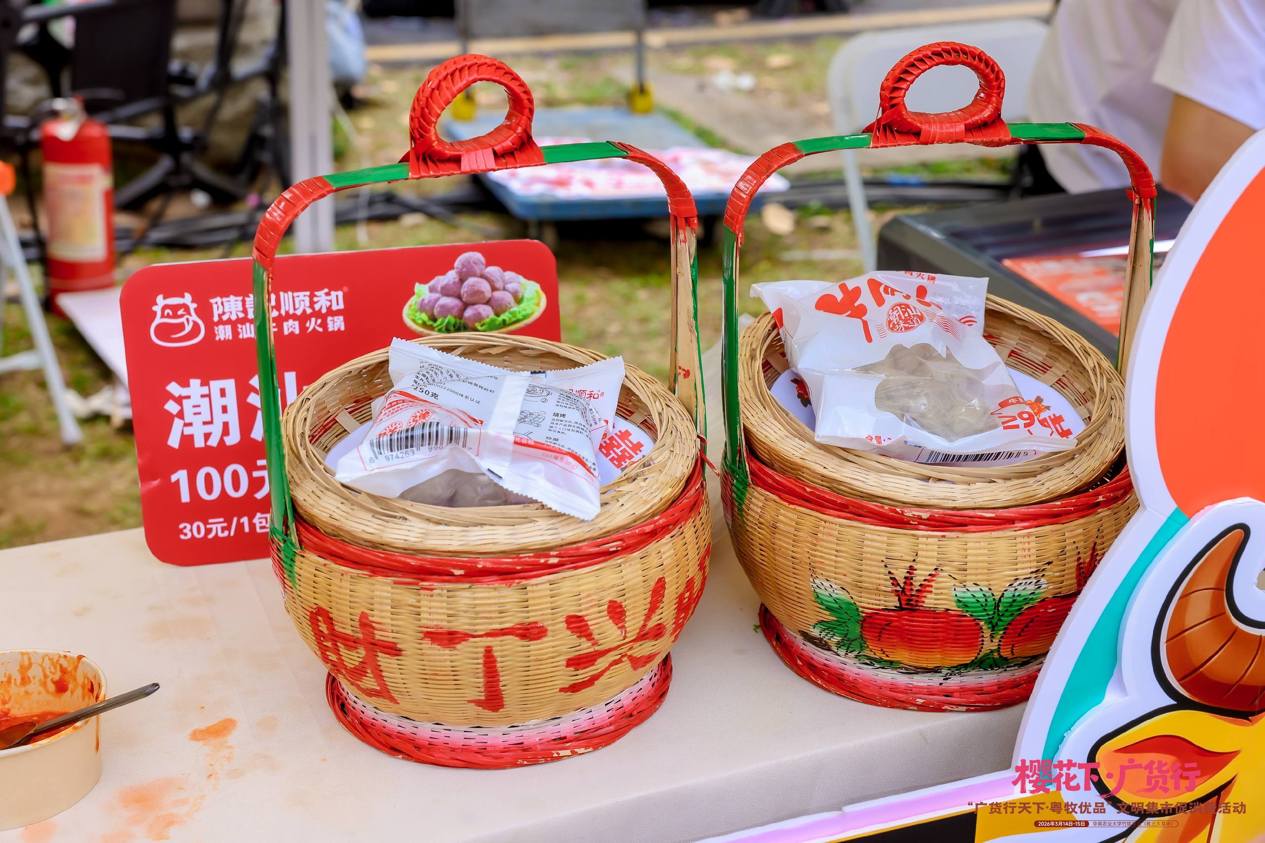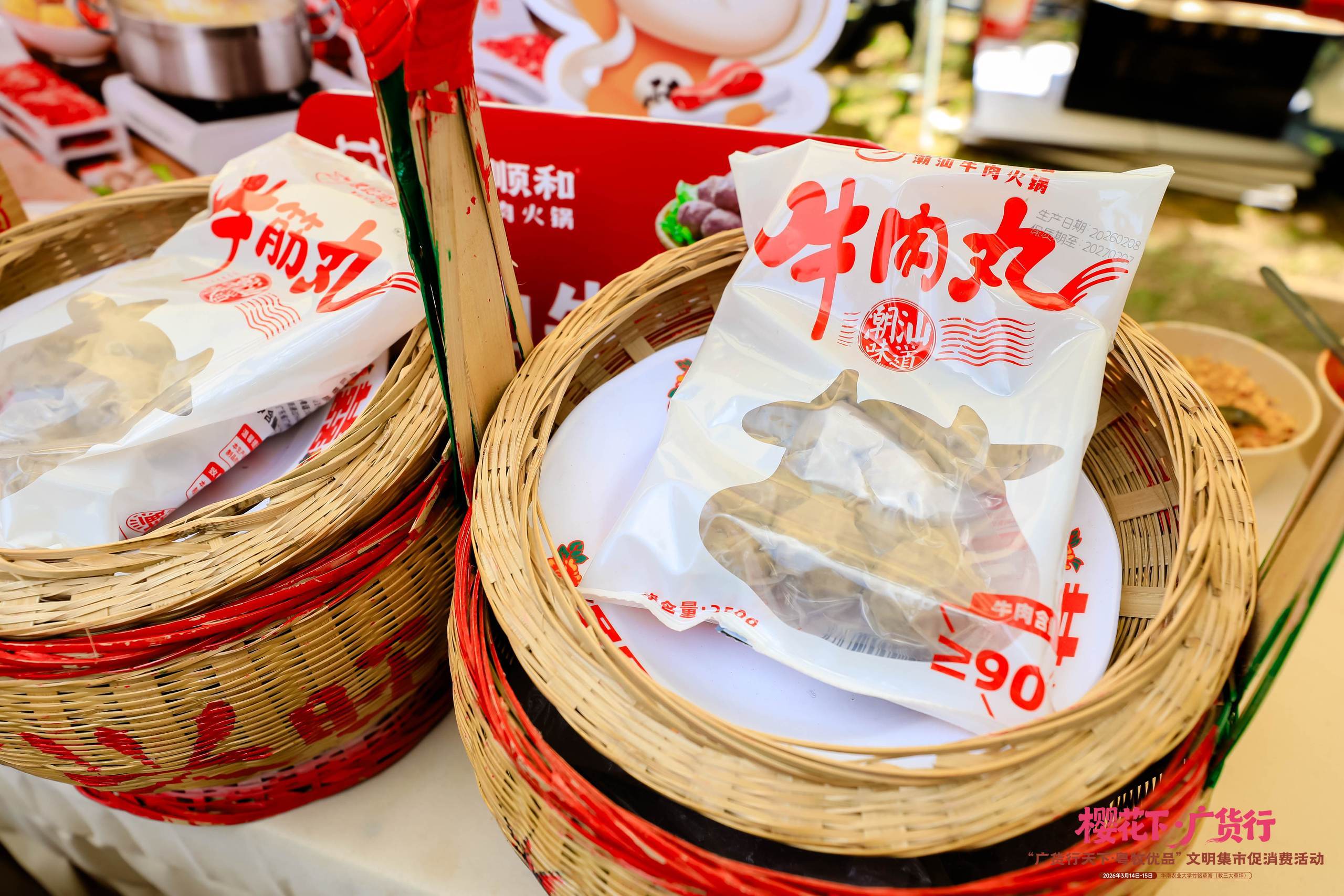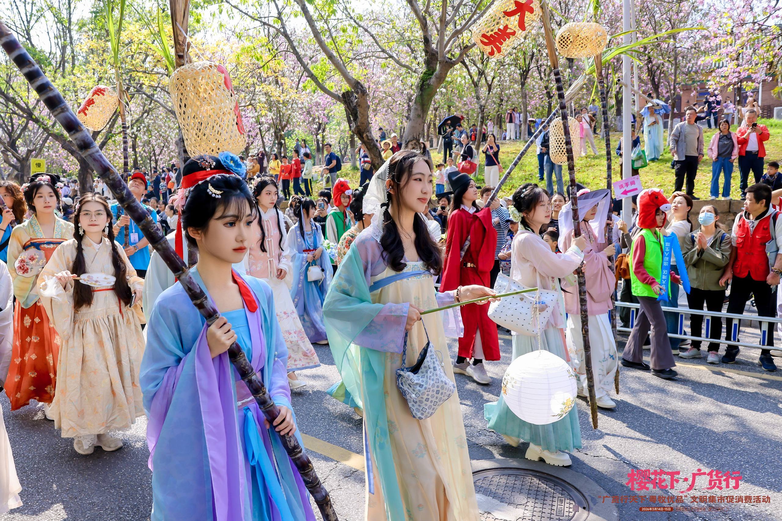 近2000株樱花盛开,花雨落满林荫道,粉白交错的紫荆花瓣也落在一排排热闹的摊位之间,人群与花影交织在一起。牛肉丸翻滚出热气,土鸡、烤牛蛙肉、腊味香味四溢。