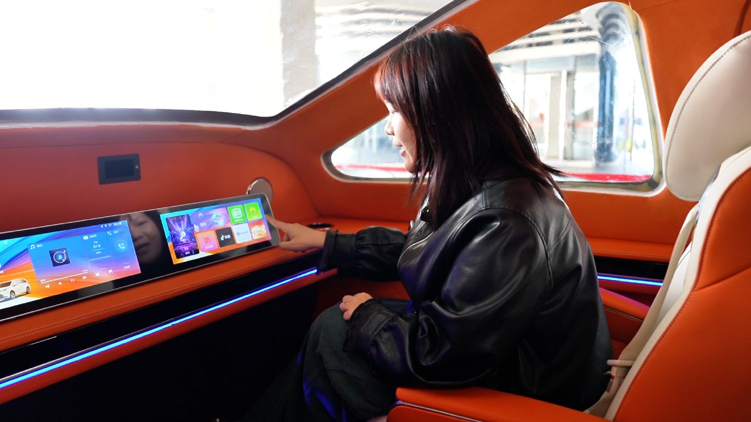走进机舱,未来感扑面而来:没有仪表盘、方向盘,一块1米长的可触摸电子屏取代了传统驾驶台,追剧、听歌等娱乐功能一应俱全。4个皮质座椅宽敞舒适,身高1.8米的乘客也能伸展自如。