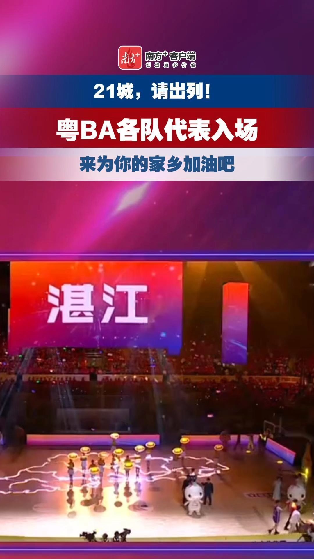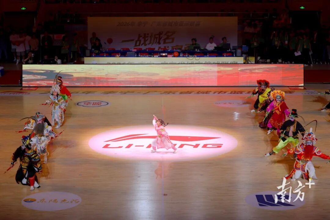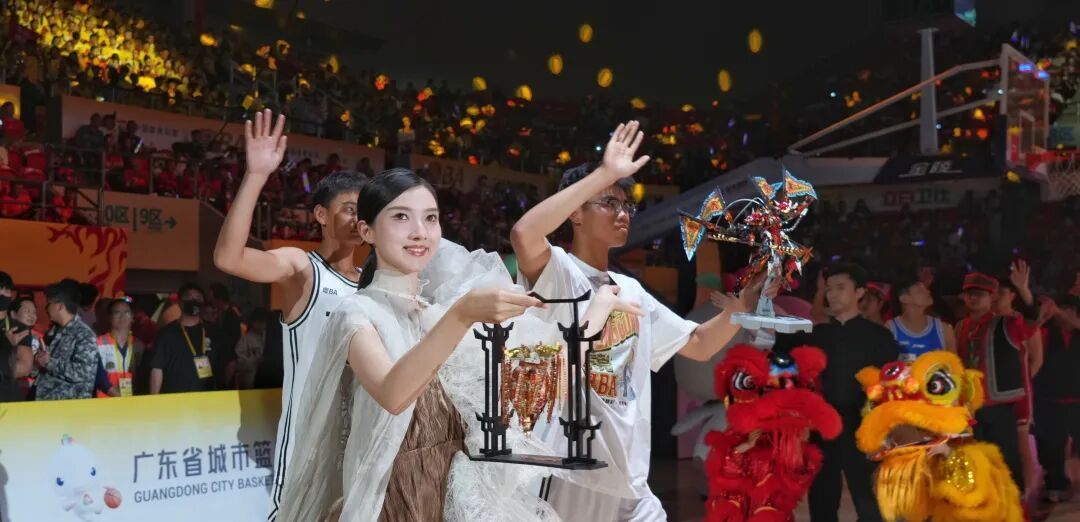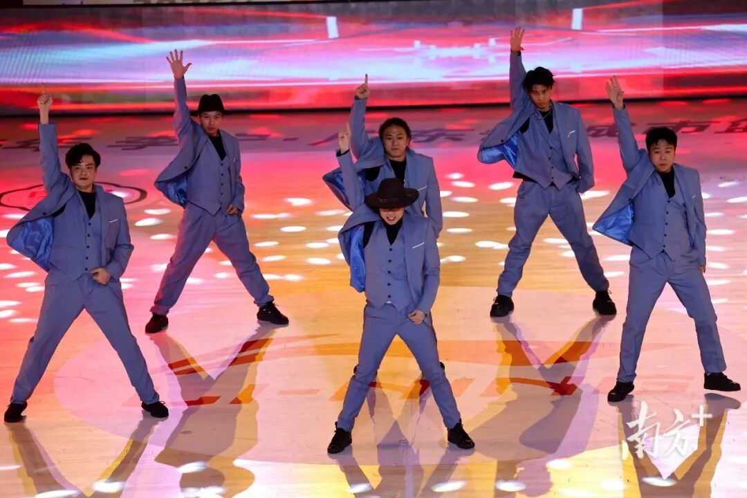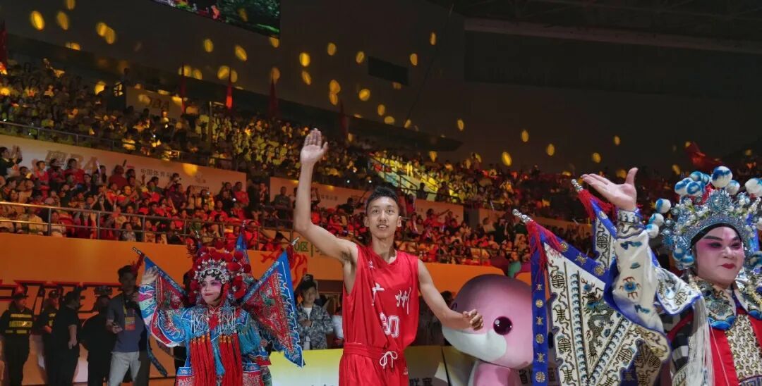 在赛前30分钟的开幕仪式中,“大湾鸡”、英歌舞、花式篮球等节目精彩上演,但让人印象最为深刻的莫过于21个地市代表队入场时刻,每支球队都带着各自城市的特色亮相,为自己的家乡代言。