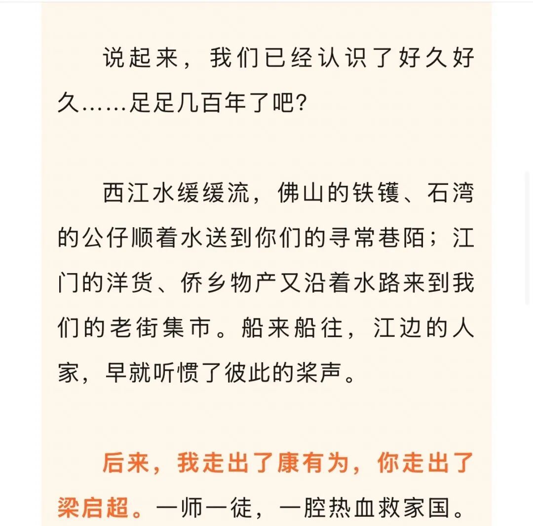 同饮西江水,佛山唤江门“阿江”。《致江门的一封信》里写满西江水路的旧时光:“船来船往,江边的人家,早就听惯了彼此的桨声。”几百年的水路往来,早已把两座城市紧紧连在一起。