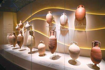 一面靠墙的大通柜里展示了两排双耳陶罐,它们是地中海贸易中常用的容器,其修长的器身和尖底设计,便于分层堆放、紧密嵌合,能最大限度地减少航运中破损的风险。这类陶罐主要用于运输葡萄酒、橄榄油、鱼酱及其他大宗商品,陶罐的器型特征和彩绘铭文、印章标记提供了关于生产者、商人和贸易路线的信息。这些发现显示了庞贝作为地中海贸易枢纽的重要地位,其产品能够传播至罗马帝国疆域之外。