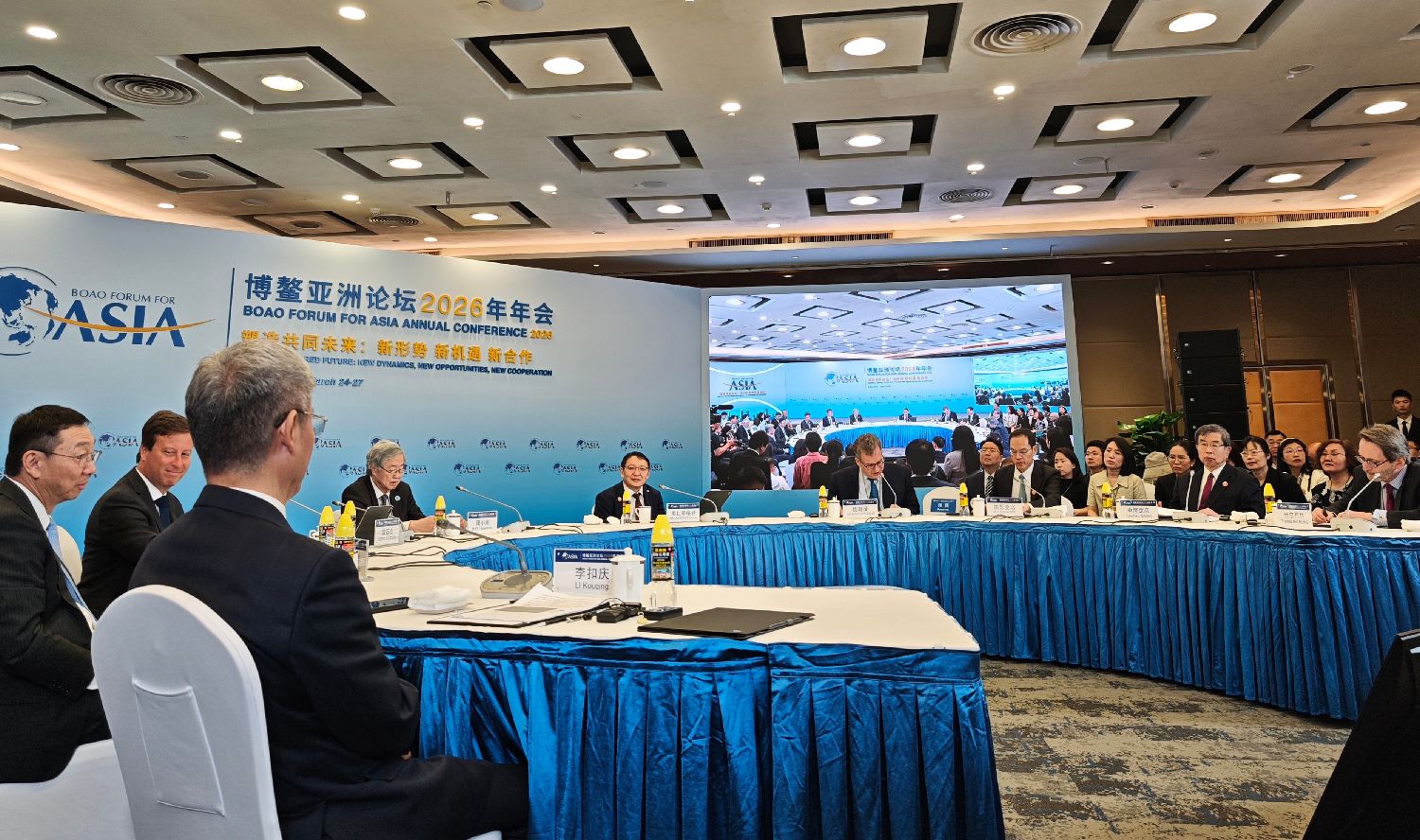 25日,博鳌亚洲论坛2026年年会期间,与会嘉宾就“加强区域联动,维护金融安全稳定”议题进行讨论。(图片来源:中新社)