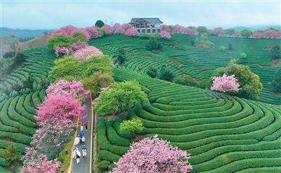 图为游客在福建省漳平市永福镇台品樱花茶园游玩。