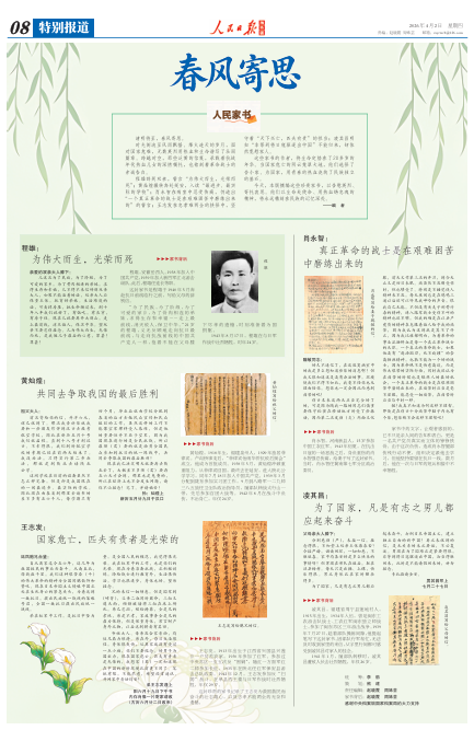 今天,本版摘编这些珍贵家书,以告慰英烈、寄托哀思。他们以生命赴使命、用热血铸忠魂的精神,将永远镌刻在民族的记忆深处。