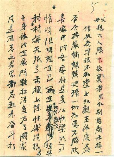 儿这次为了民族,为了阶级,为了可爱的家乡,为了骨肉相连的弟妹,求得生存和幸福,儿不得不来信辞别双亲大人,如果不能活着的话,双亲大人应保重玉体,抚育好弟妹。生活难度的话,可卖掉房屋,把生命糊过来,到十年八年我们就好了,有饭吃,有衣穿,有房子住。现在儿就要离开大别山,走上最前线,消灭敌人,保卫中华。望双亲不要悲伤挂念。儿为伟大而生,光荣而死,是我做儿子最后的心意,罪甚!罪甚!