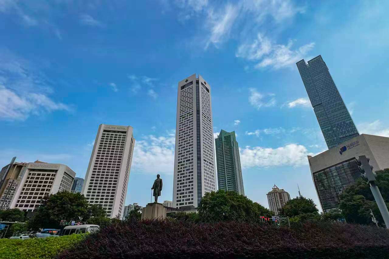 南京新街口孙中山铜像与现代化高楼。(图片来源:中新社)