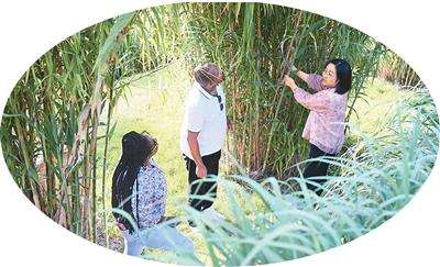 林占熺长女林冬梅(右)为留学生介绍菌草的生长情况。