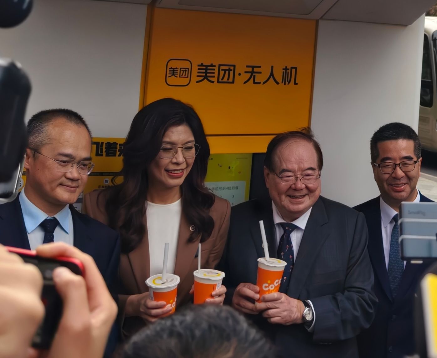 4月8日下午,中国国民党主席郑丽文参观美团上海总部,并体验无人机送外卖奶茶。(图片来源:中新社)