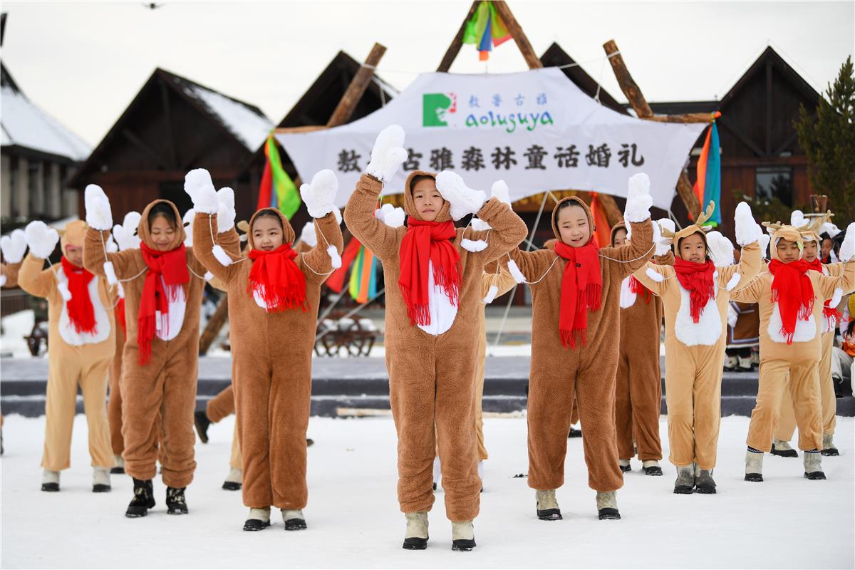 冬日的敖鲁古雅使鹿部落景区银装素裹、宛若秘境,热闹的音乐声响起,一场盛大的森林童话婚礼拉开帷幕。几只可爱的驯鹿拉着红色雪橇,载来满满的礼物,身穿亮丽民族服饰的20对新人在鄂温克族长者的见证下,按照传统仪式交换信物、许下誓言……