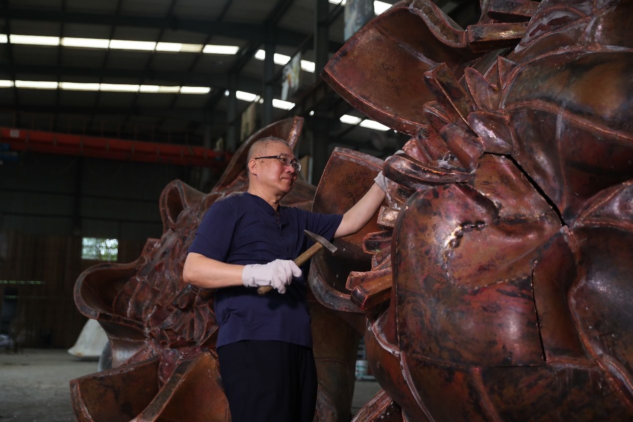 徘徊其中,几个由红铜锻塑而成的葵盘,分散在户外区域,平均重量都在2吨以上,阳光下闪现出源自土地的色彩。