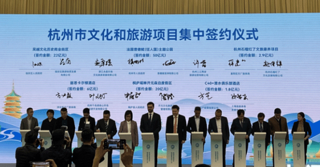 本报讯(王题题)3月22日,在浙江杭州召开的杭州市旅游业高质量发展大会上,杭州集中签约14个重大文旅项目,总投资418.83亿元。其中,杭州与法国普德赋(狂人国)签订了计划总投资50亿元的项目合约,将在杭州选址“三江两岸”沿岸区域建设一座新的主题公园。