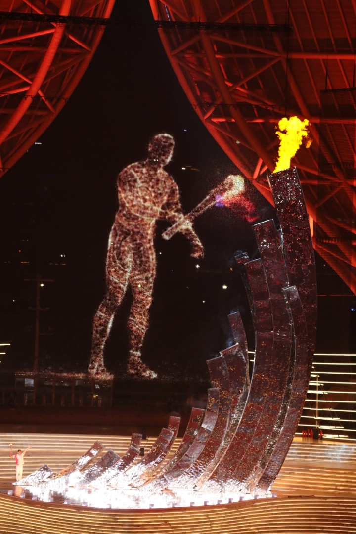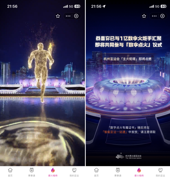 9月23日21点55分,随着第一棒火炬手叶诗文入场,杭州亚运会开幕式最大悬念开始揭晓:上亿火炬线上传递参与者如星星点点的火苗,在杭州汇聚形成一个巨大的“数字火炬手”,它踏浪过江,从“大莲花”上空“跃”入现场的立体网幕,与第六棒火炬手汪顺相汇,共同点燃了主火炬塔。亚运史上首个“数实融合”的点火仪式,成为本次亚运开幕式的经典记忆之一。