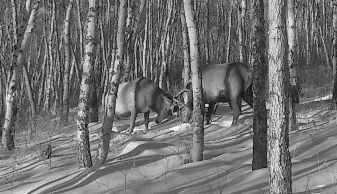 视频里,一只体型较大的马鹿在雪地里捕捉到食物,一边咀嚼品味着美餐,一边踱步寻找下个目标,无意间它好像看见绑在树上的红外相机,好奇地用鼻子闻一闻,样子憨态可掬。傍晚,在丛林间捕捉到两只驼鹿,用头上的角相互顶来顶去嬉闹的影像。