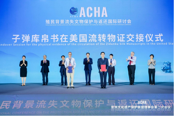 会上,美国芝加哥大学夏德安教授将该校图书馆收藏的长沙子弹库战国楚帛书第二卷和第三卷在美国流转物证移交国家文物局。