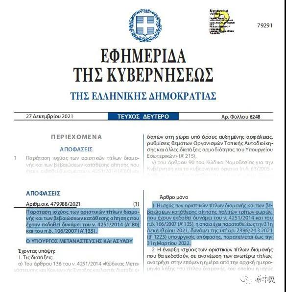 根据12月27日最新公布的希腊联合部长级决定,延长根据4215/2014号法案和106/2007号总统法令颁发的居留证和居留等待纸的有效期。
