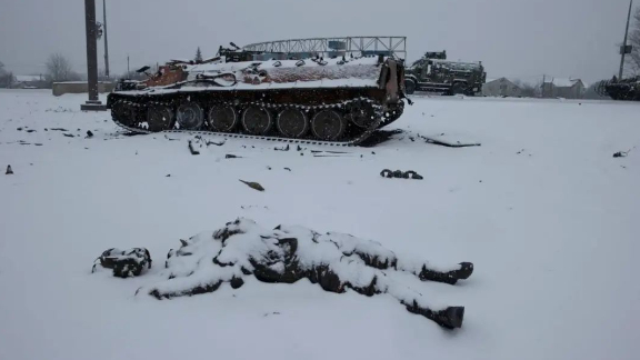 一辆被击毁的战车,附近一名阵亡的士兵已经快被大雪掩埋