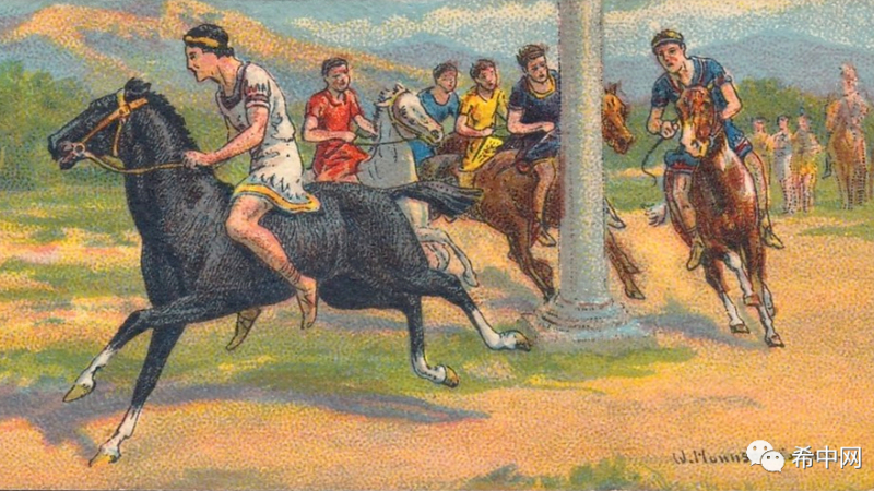 根据米勒的记录,赛马比赛在公元前648年被列入奥运会。比赛全长约1.2公里,年轻男性,亦或是奴隶将驾驭马匹,没有马鞍和马镫,仅仅使用缰绳和鞭子来控制马匹进行赛跑。