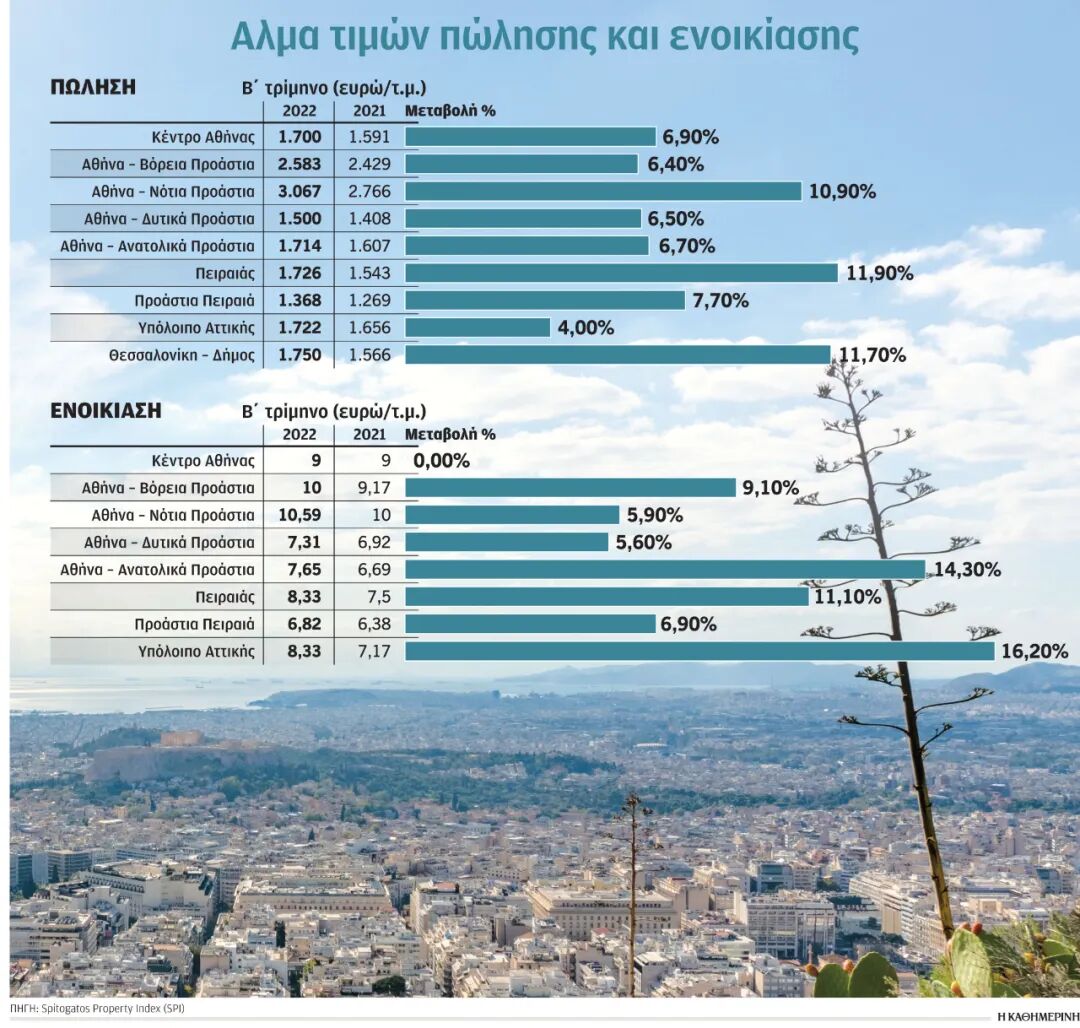 然而,这种情况开始显示出各地区的一些差异。例如,在高需求地区,如雅典市中心和北部郊区,第二季度的价格增长率低于第一季度。根据相关数据,在第二季度,雅典市中心的房价上涨了6.9%,平均为1700欧元/平方米,而去年同期为1591欧元/平方米。