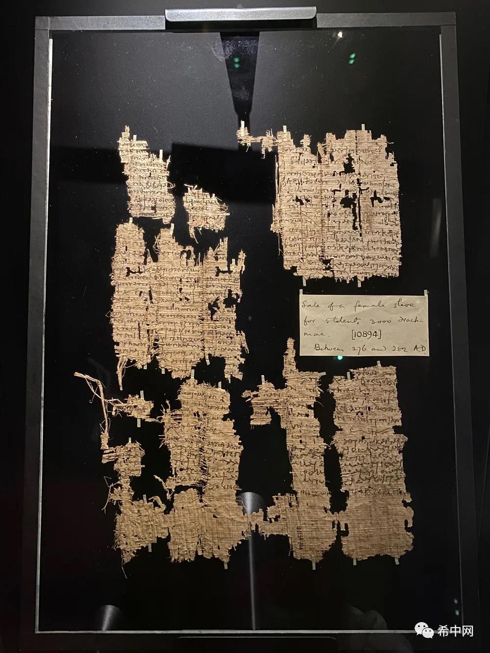 在一块人像石碑上,描绘了一名身着希腊服饰的男人,他两边的豺狼头神使则明显是埃及神阿努比斯。此外,展出的希腊文纸张和石碑也显示出希腊文在当时的埃及流行与广泛使用。