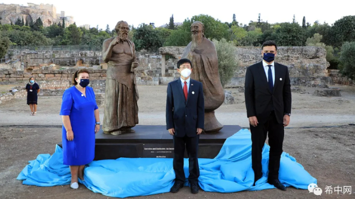 随后王强与门佐尼、基基利亚斯为中国美术馆馆长吴为山捐赠的雕塑作品“神遇——孔子与苏格拉底的对话”揭幕。雕塑通过呈现孔子和苏格拉底两位圣哲跨越时空的思想交流和对话,表现中希两国文明互鉴、共同发展以及人类命运休戚与共的理念。
