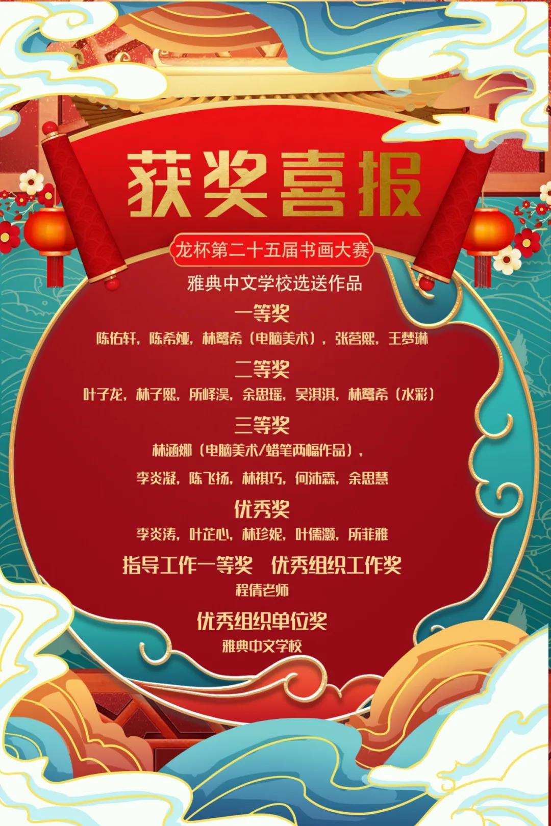 第25届龙杯全国中小学绘画书法作品比赛希腊赛区成绩揭晓啦!此次大赛希腊赛区共接收到近100幅参赛作品。希腊赛区成绩优异,荣获一等奖12人,二等奖14人,三等奖9人,优秀奖5人。