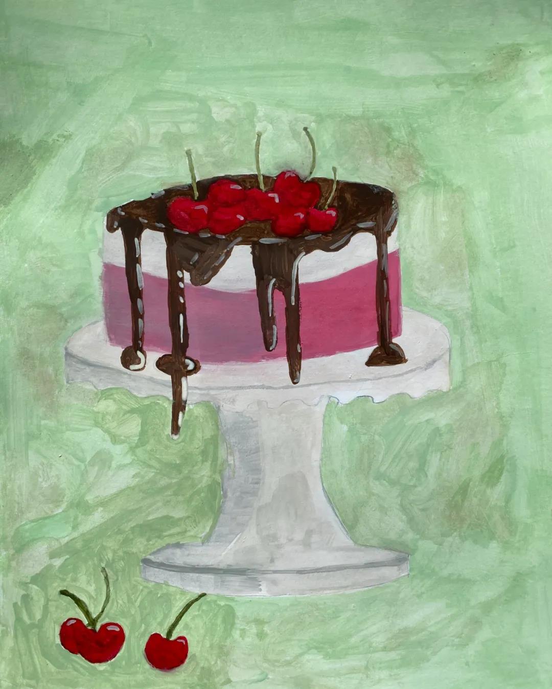 我用水彩画了一个新鲜,漂亮的奶油巧克力樱桃蛋糕。香甜美味的奶油和巧克力就像甜美的童年,每一天都快乐美好。蛋糕上鲜艳欲滴的新鲜的樱桃,就像小朋友一样朝气蓬勃充满活力。我们要珍惜美好童年的每一天,好好学习,天天向上,不负韶华。