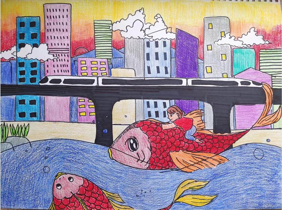 这张图画的主人公为小女孩和她的田鱼们。在小时候就幻想着来到城市游玩。终于,某一天她们找到一次机会,从乡下游到了城市里,为见识一翻那和乡村朴实无华生活而不一样的忙碌城市生活。她们看到了高铁,看到了大厦,和美丽的晚霞,一种欣喜和骄傲从内心的深处发出,原来祖国是如此的美好强大。