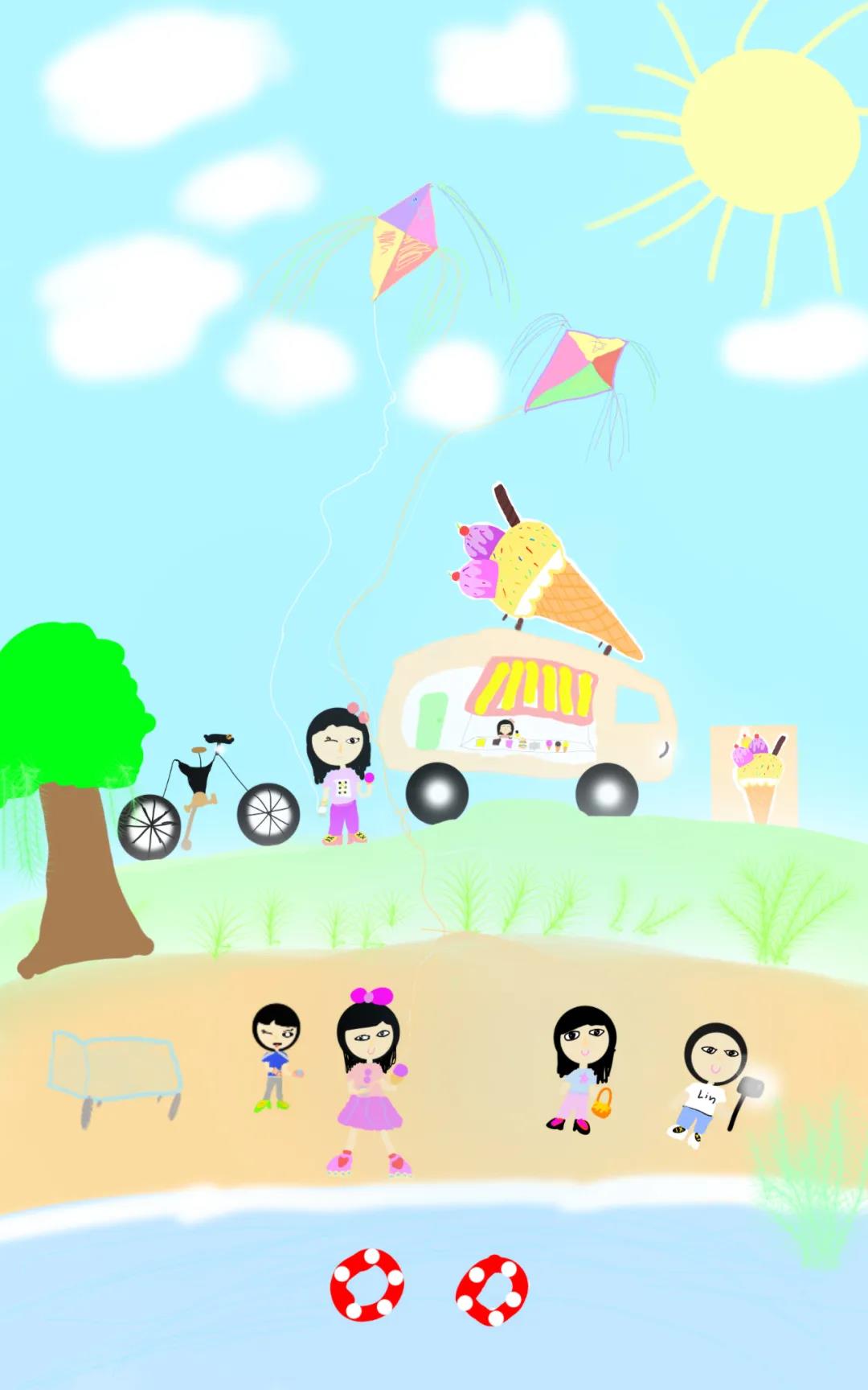 夏天来啦!我们一家人去沙滩玩,妹妹带着溜冰鞋玩,弟弟叫了妈妈拿披萨和水,我和妹妹叫妈妈帮我们俩买冰激淋吃,爸爸带着摄像机拍照/录视频,妈妈带了食物给我们当午餐,我们吃了好多好吃的,玩了好多游戏,还游泳了呢。夏天来啦——这就是我们期盼已久的夏日!