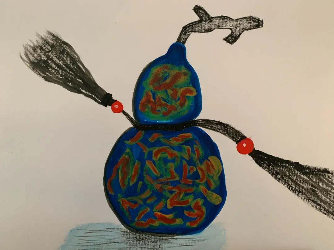 所峄淏5岁《葫芦》二等奖回国看到姥姥种的葫芦,自己亲手摘了一个葫芦,看到葫芦就想到了《葫芦娃》的动画片,我画的是蓝色葫芦,他可以隐身哦!