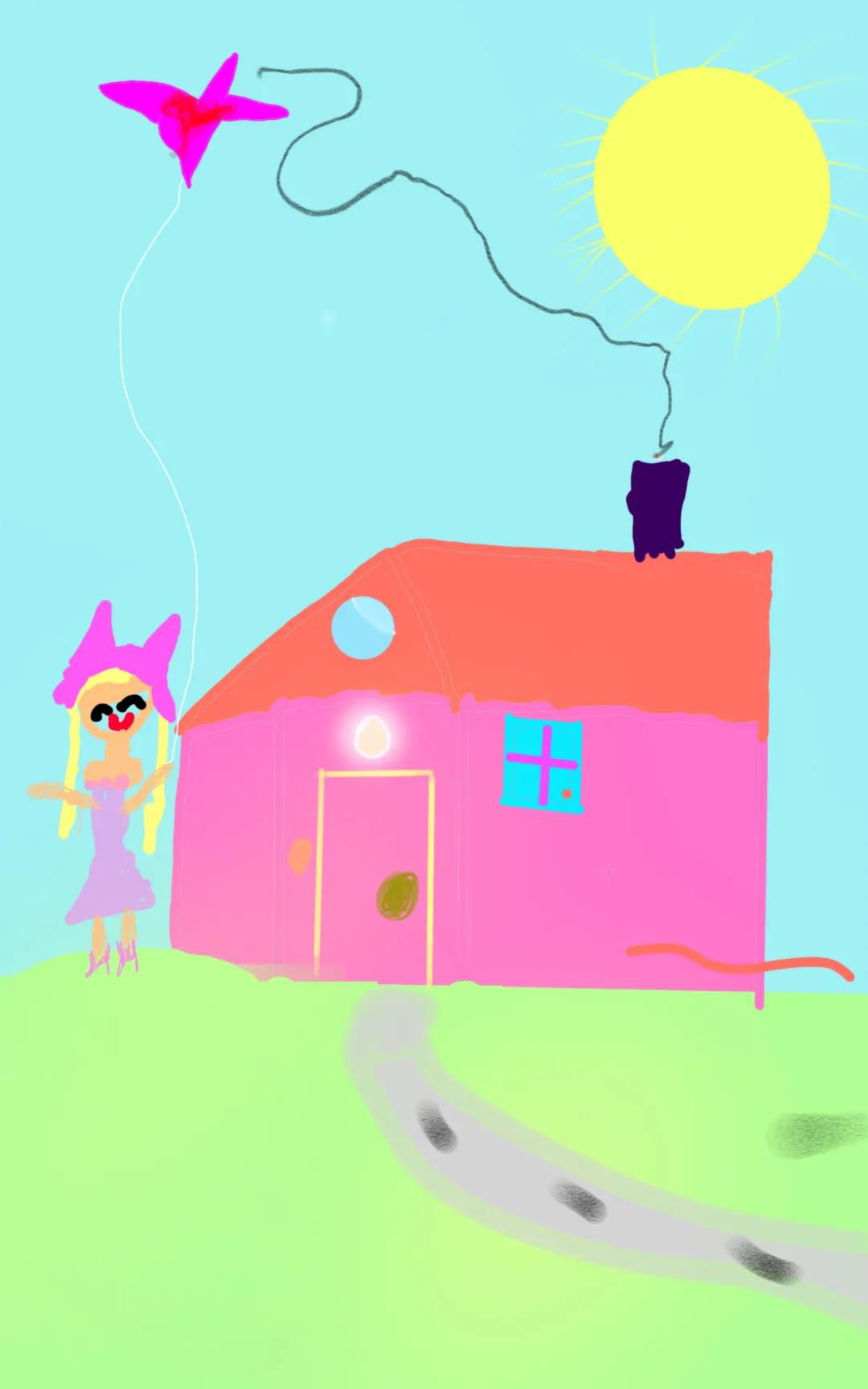 我的家,我的家门上有台灯,它会发光,等我把开关关了的时候,它就不亮了。门的旁边有个门铃,门铃旁边有个小姑娘叫美美,房顶的上面有个烟囱,里面正在烧饭,小姑娘美美在旁边玩风筝。