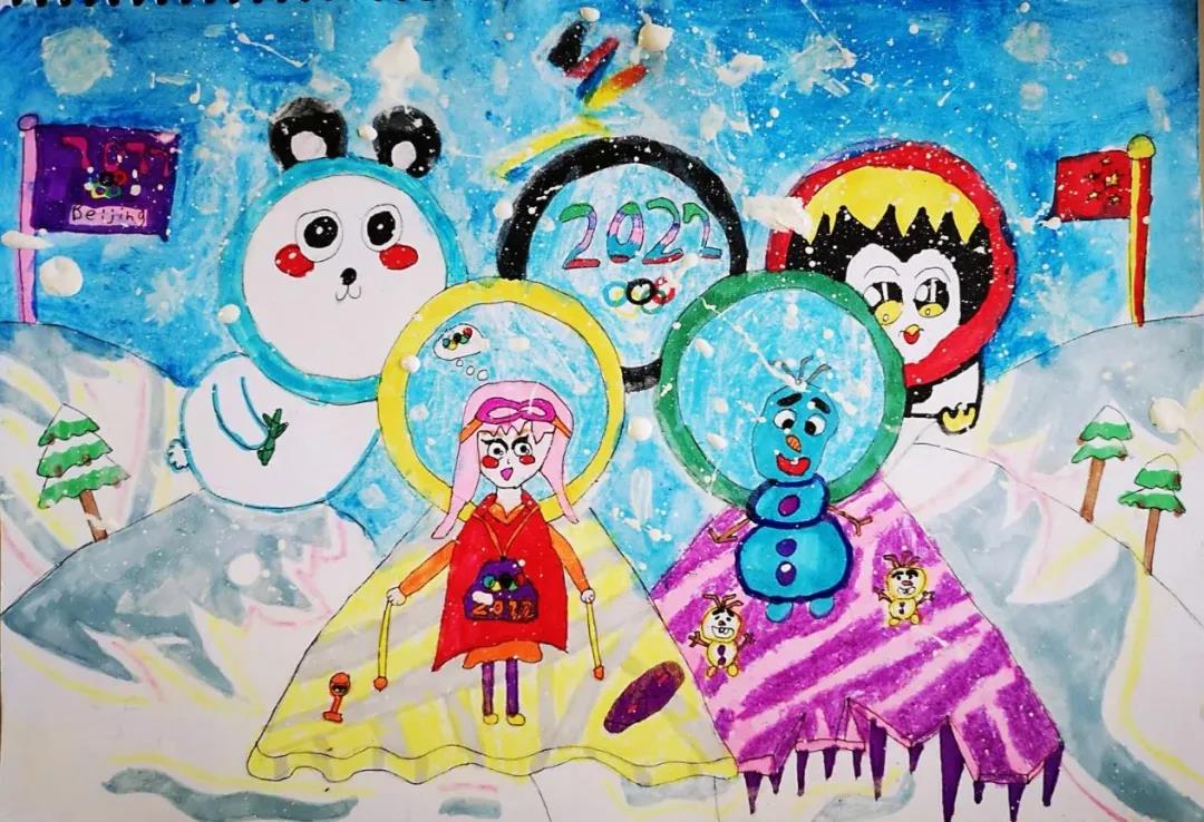 围绕2022年北京冬奥会构想出的冰雪奇缘人物的滑雪比赛充分结合奥运五环为背景展现出动画片中的四个不同人物造型,利用水粉为绘画材料,五彩斑斓的颜色体现出了全世界人民对即将举办的冬奥会的美好向往,同时也展现了一个8岁孩童对自己所喜爱的动漫人物的充满想象力的构画,期待2022年冬奥会的成功举办,也预祝中国体育健将勇夺金牌🥇,再创佳绩!