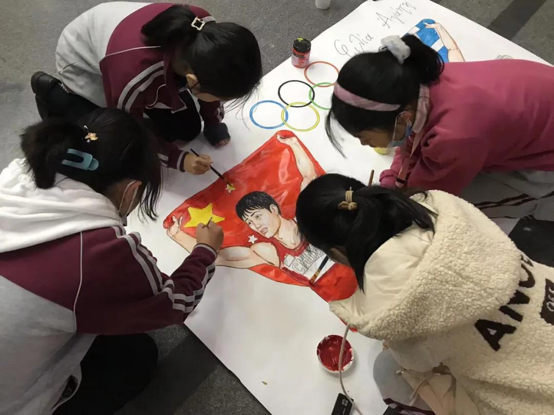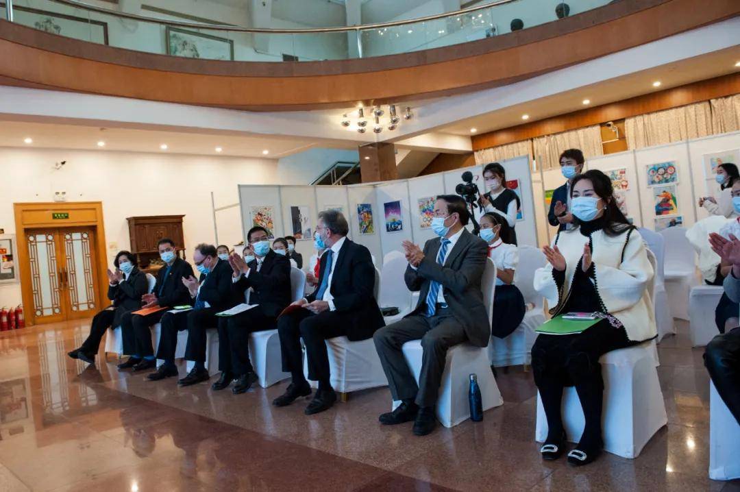画展开幕式:两所学校的学生们以奥运精神,冰雪运动和古代文学为主题,各自创作了绘画作品并集结成展。