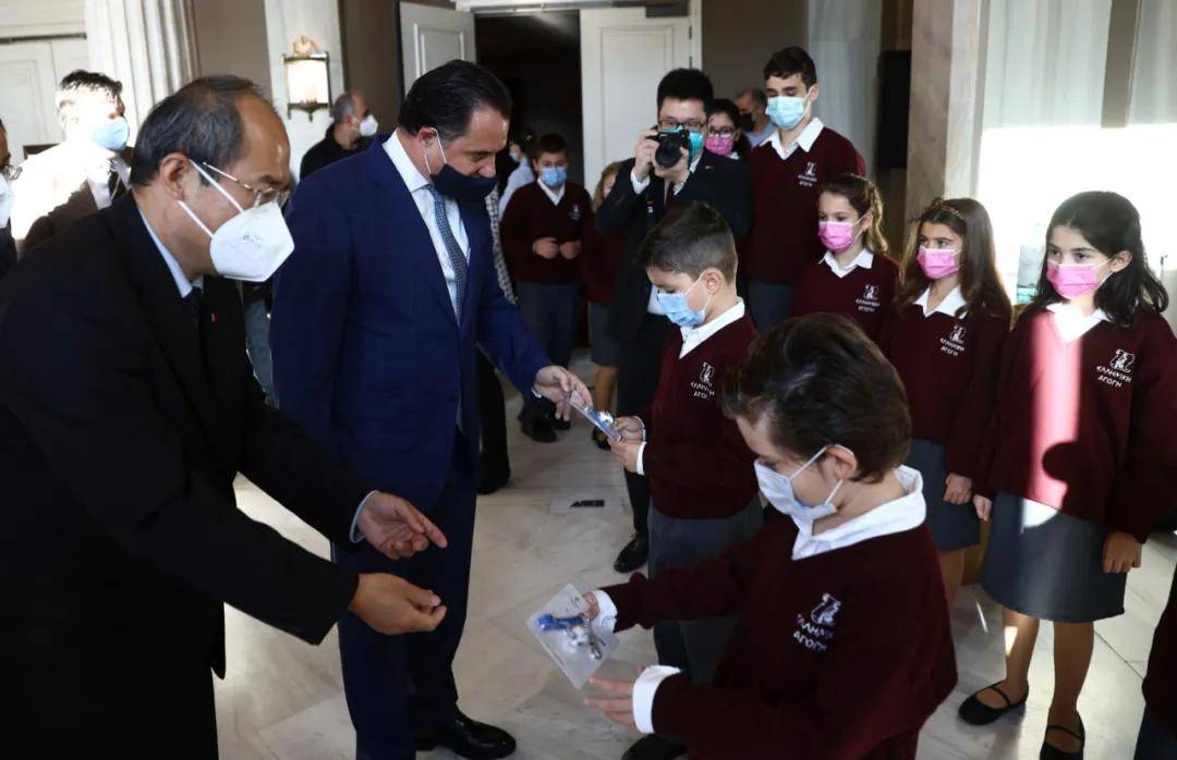 投资发展部部长、《希腊教育》学校主席阿多尼斯·乔治亚德斯(Adonis Georgiades)先生在致辞中强调:(在像《希腊教育》这样的学校中,这样一所有着26年建校历史,着重教授古希腊文化和古希腊语的学校)培养青少年讲流利的希腊语具有重要意义。北京奥运会提醒我们,作为西方文明与东方文明起源的希中两大文明拥有共同的发展轨迹。预祝北京冬奥会取得圆满成功,也祝贺参加本次独特活动的所有学生们取得更大的进步。