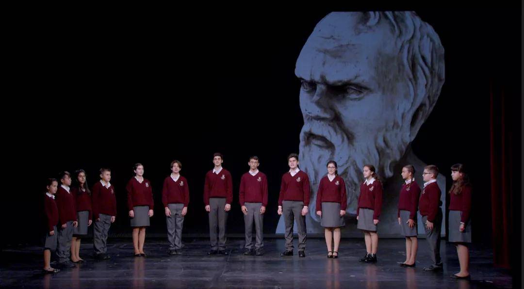 希腊教育学院学生表演“让我们一起走向哲学!”这部戏剧引用希腊哲学中著名片段,是一部原创合集。《希腊教育》学校的学生们化身为古代哲学家,并向永恒的哲学问题给出自己的答案。