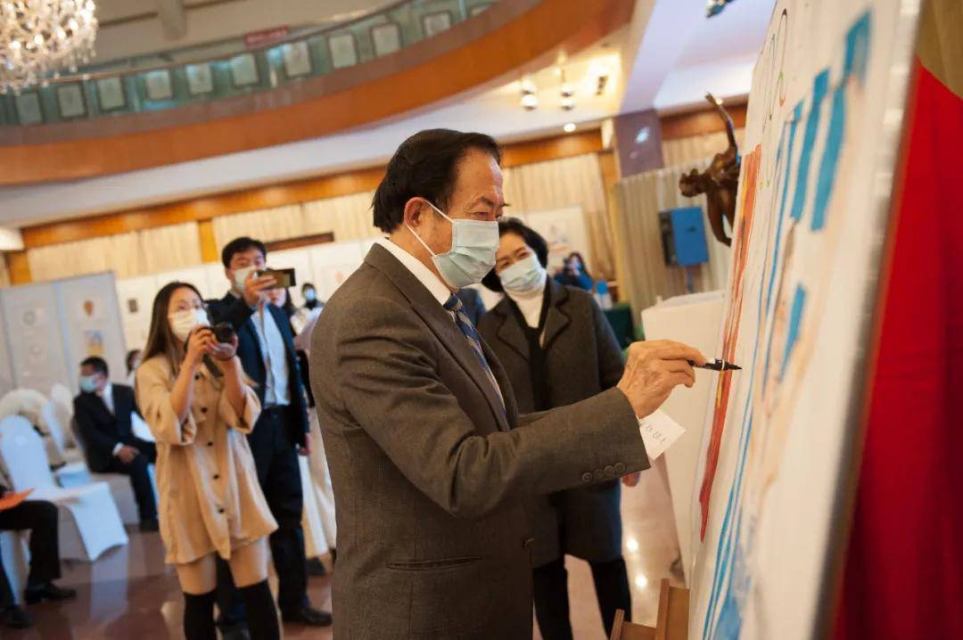 乔治·伊利奥普洛斯大使和袁熙坤主席分别在中国与希腊青少年合力创作的大画《友谊热爱和平》上题词:“追求卓越”和“更高,更快,更强——更团结”