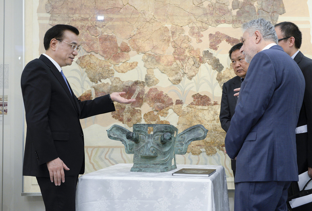 李克强向博物馆赠送三星堆出土文物复制品。(图片来源:中新社)