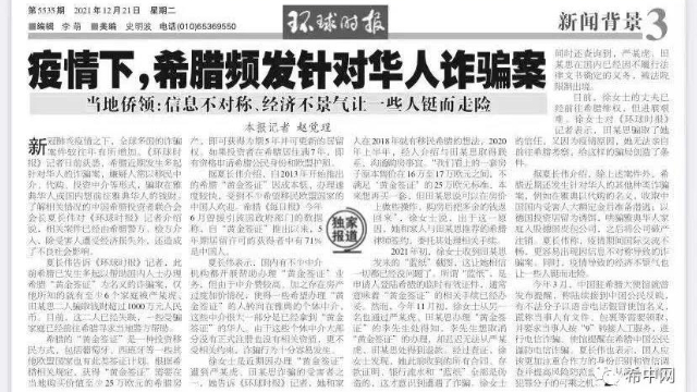 夏长伟告诉《环球时报》记者,此前希腊已发生多起以帮助国内人士办理希腊“黄金签证”为名义的诈骗案,仅他所知的就有至少6个家庭被严某虎、田某思二人骗取钱财超过1000万元人民币。目前,这二人已经失联,一些受骗家庭已经前往希腊寻求当地警方帮助。