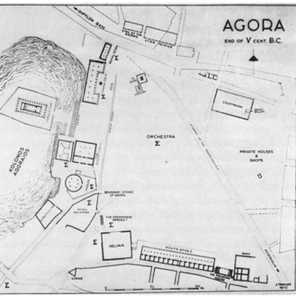在这张对公元前5世纪晚期古集市的平面复原图上,Σ标注的位置表明“苏格拉底曾在此”。那时的古集市里,很多如今能看到的建筑尚未建立,如阿塔罗斯廊柱中部廊柱等,古集市空旷很多,相对于之后市政功能更弱,可以更大程度上实现市场功能,但也更便于不同阶层不同身份的人聚集。在这样的环境里,苏格拉底容易与不同的人交流,产生思想的碰撞。