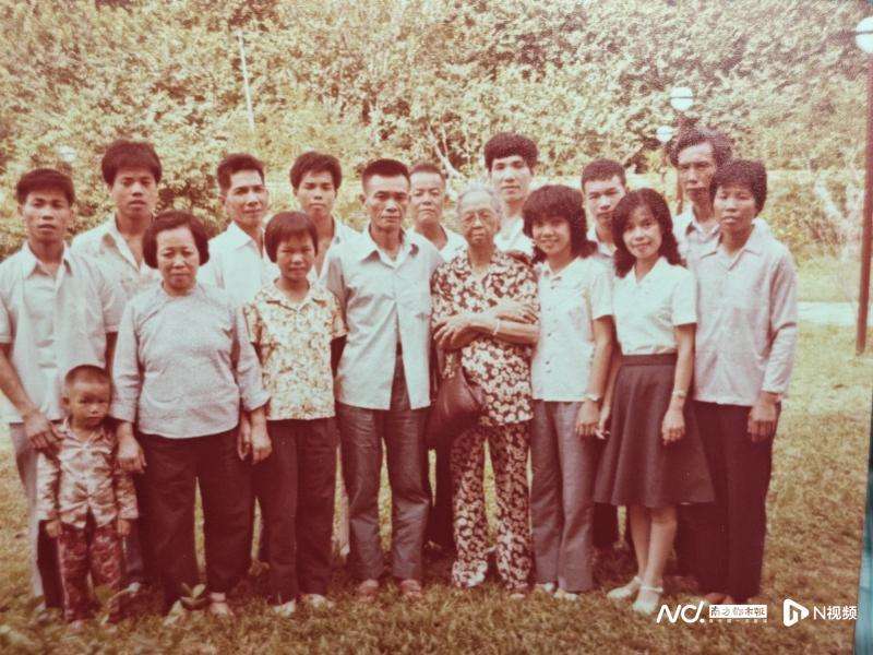 郑社心在新加坡家中给南都N视频记者找出母亲钟彩合(前排右四)、弟弟郑社义(前排右五)等家人的合影,这张照片拍摄于上世纪八十年代。