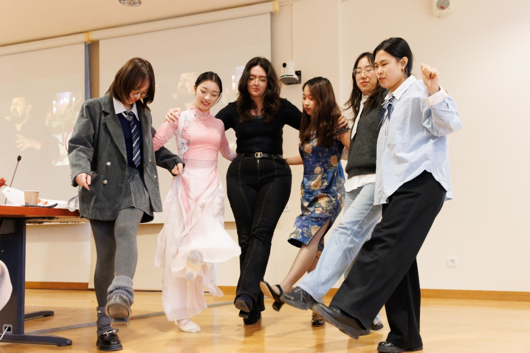 舞乐体验区气氛热烈,吸引了许多师生驻足尝试。支队同学身着典雅汉服,邀请希腊同学体验学习中国舞的基本仪态与手势步伐;希腊同学也热情满满地向支队同学展示希腊本地舞蹈,轻快的节奏与活泼的舞步迅速拉近了彼此的距离。大家一同录制舞蹈视频,用灵动的舞姿定格交流的欢乐瞬间。