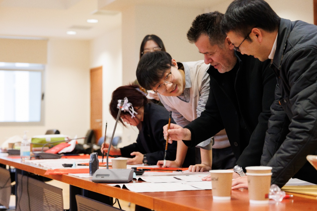在书法体验区,笔墨纸砚陈列井然。支队同学借助AI翻译技术,为每位参与的希腊师生生成了专属的中文名字,大家在队员的细致指导下学习执笔姿势与运笔方法,一笔一划认真书写自己的中文名字,感受汉字的线条美感与笔墨韵味。体验区还同步开展了春联共创活动,两校师生共同挥毫泼墨,一幅幅红彤彤的“福”字,既寄托着对新年的美好祈愿,也凝聚着对中希友谊的真挚祝福,纸墨间洋溢着中希师生间心意互通的融融暖意。