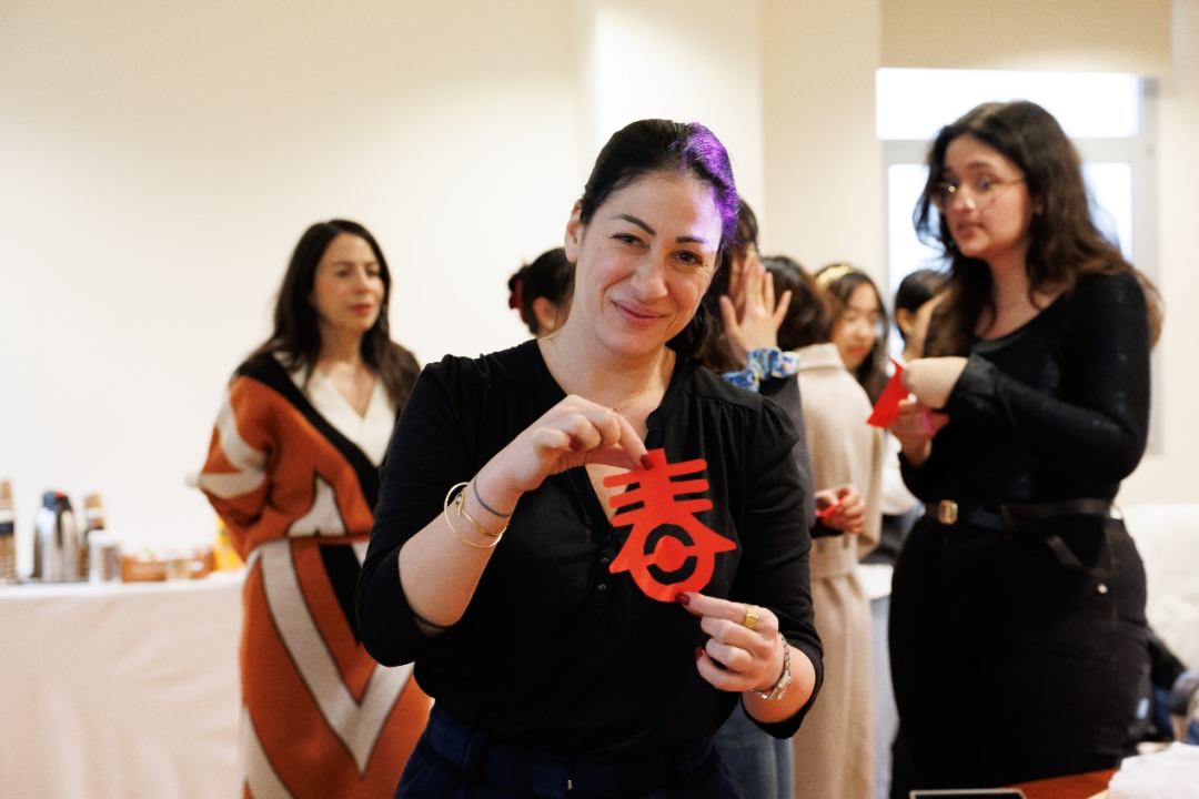 一旁的剪纸体验区同样热闹非凡,支队同学不仅提前准备了丰富多样的剪纸图样,还现场示范了折纸、裁剪的基本技巧,希腊师生兴致盎然,在初步学习后纷纷挑选喜爱的剪纸图案动手尝试。寓意吉祥的金元宝、活泼可爱的小龙人、喜庆洋溢的“春”字灯笼…伴随着中希师生的愉快交谈,各色各样的窗花剪纸也在指尖渐显雏形,一件件精巧的剪纸作品铺满桌面。