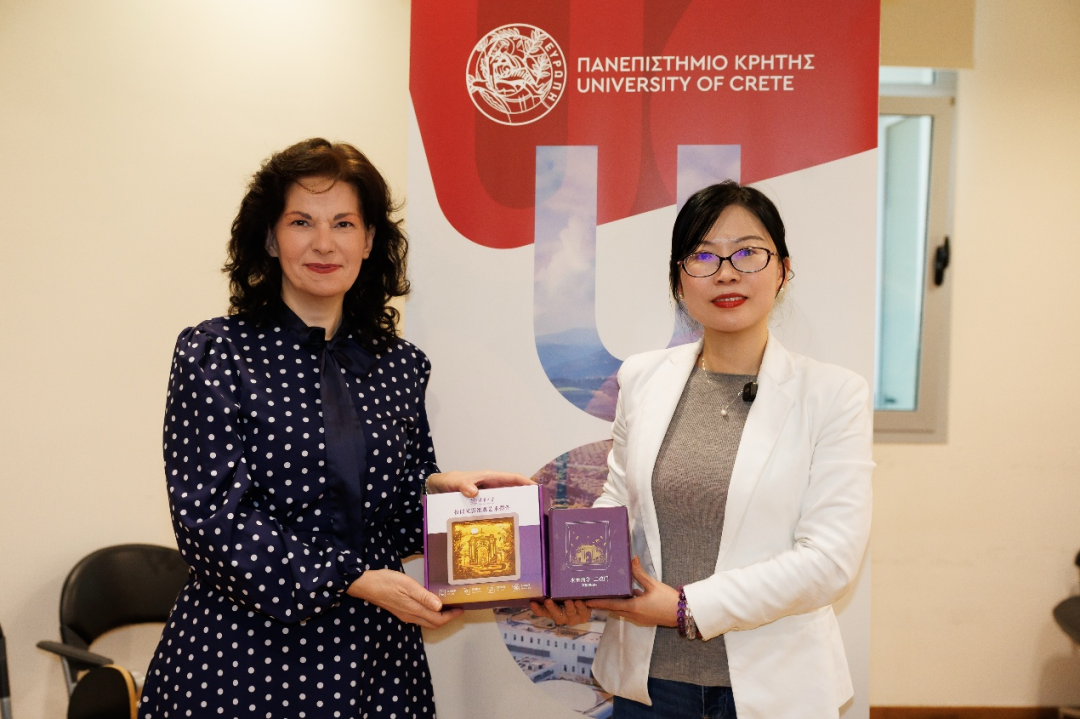 张莉教授向克里特大学副校长玛利亚·瓦姆瓦卡基赠送纪念礼品