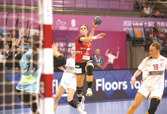 西班牙队球员(红色上衣)在与丹麦队决赛中投球射门。毕鸿丁婉毓/摄